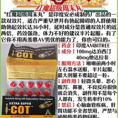 🔷红魔每粒:含他达那非40mg+达泊西汀100mg!史上最温和双效片,起效慢,持续久,没有脸红、发热等症状,适合周末旅游提前来一粒,药效持续72小时!印度最古老的药厂,安必成制药厂出品。